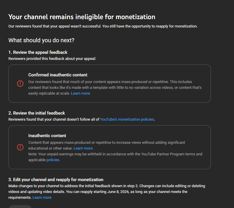 Generisan Al sadrzaj bez izmjene iskreno imam i ja 2 kanala koja saljem na pregled za 2-3 dana i ako su dosta kvalitetni Al kanali sto se tice publike i gledanosti i editovani sumnjam da ce prihvatit 20% su sanse