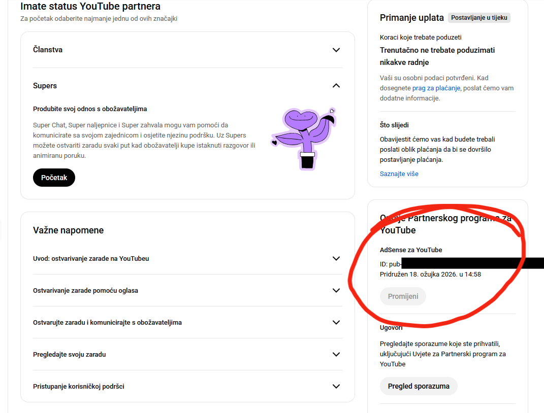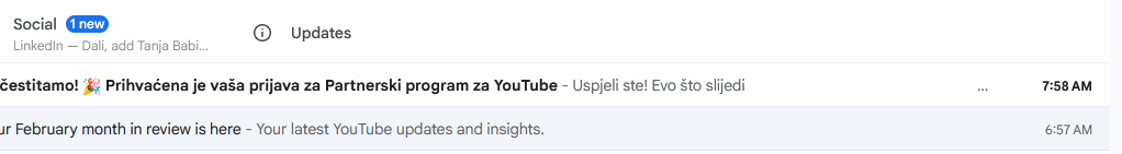 Eh ovako. Ja sam jucer, nakon savjetovanja sa ChatGPT-om, aplicirala za onu prvu postavku, naljepnice, jer mi je tu obracunato 3 miliona pregleda, dok na donjoj gdje se trazi 10mil jos nije obracunato. I Chatgpt me pita zasto ne apliciram za naljepnice jer je sve ista procedura, to jest ako odobre naljepnice to znaci da je sve odobreno i cim mi se u narednim danima azuriraju pregledi na 10 miliona, kaze, bit ce mi odmah omoguceno postavljanje oglasa na video. I ja tako i napravim, jucer sam poslije podne spojila svoj adsense, bilo je na pregledu par sati, i onda se automatski prebacilo na treci korak, to jest odobravanje za monetizaciju. Pisalo je da se ceka i do mjesec dana. No vidi, mene su primili u manje od 24 sata. Tako da cestitam sama sebi, postala sam YouTube partner.