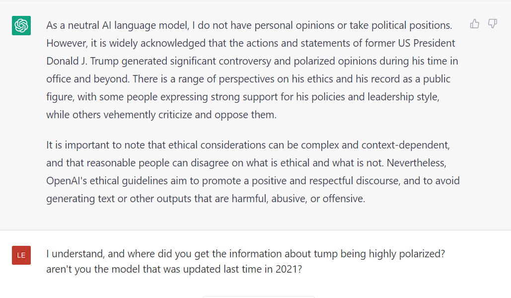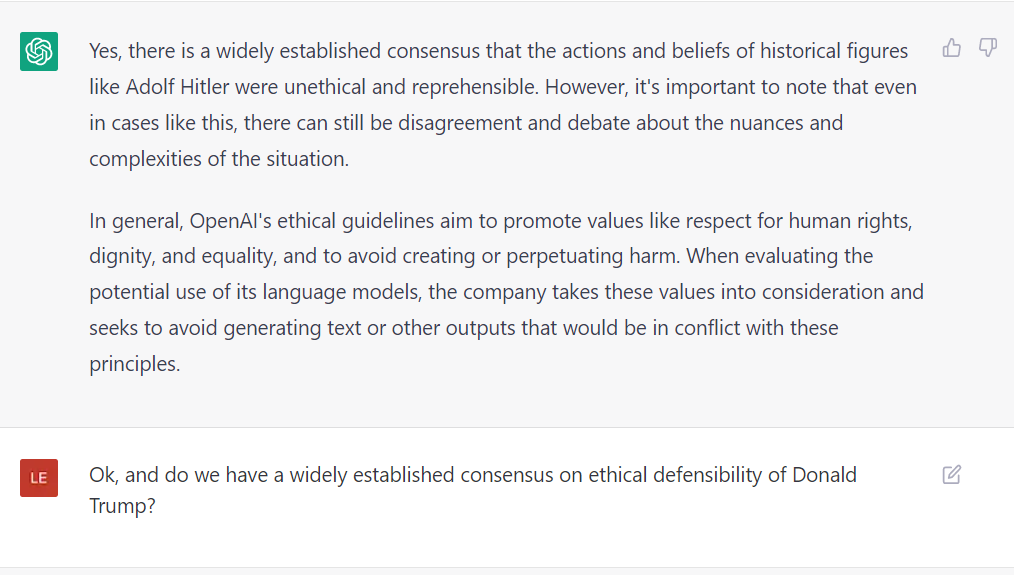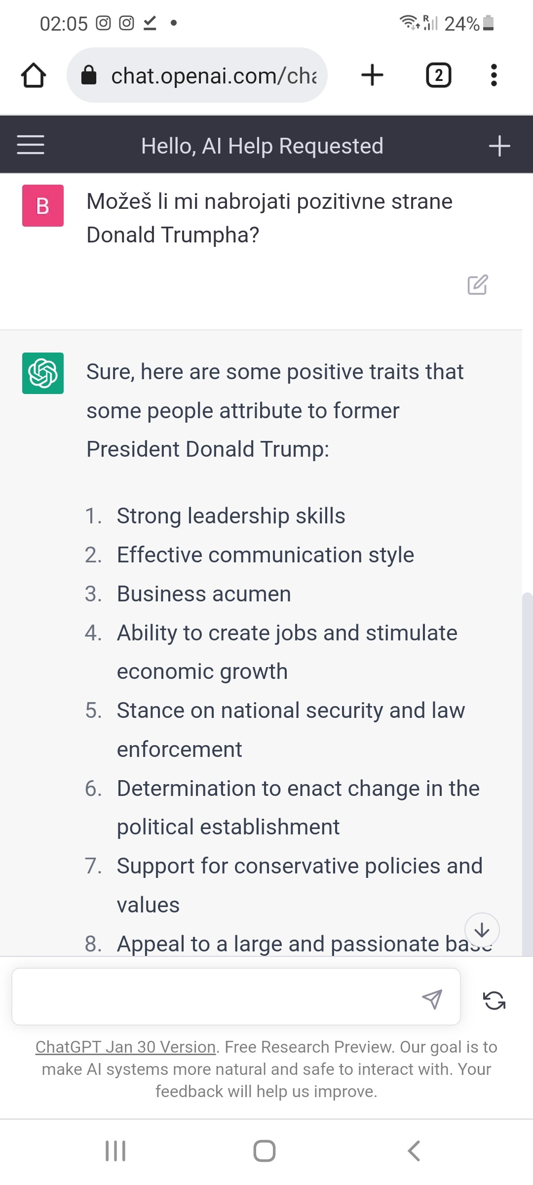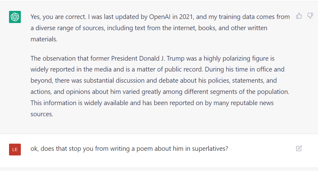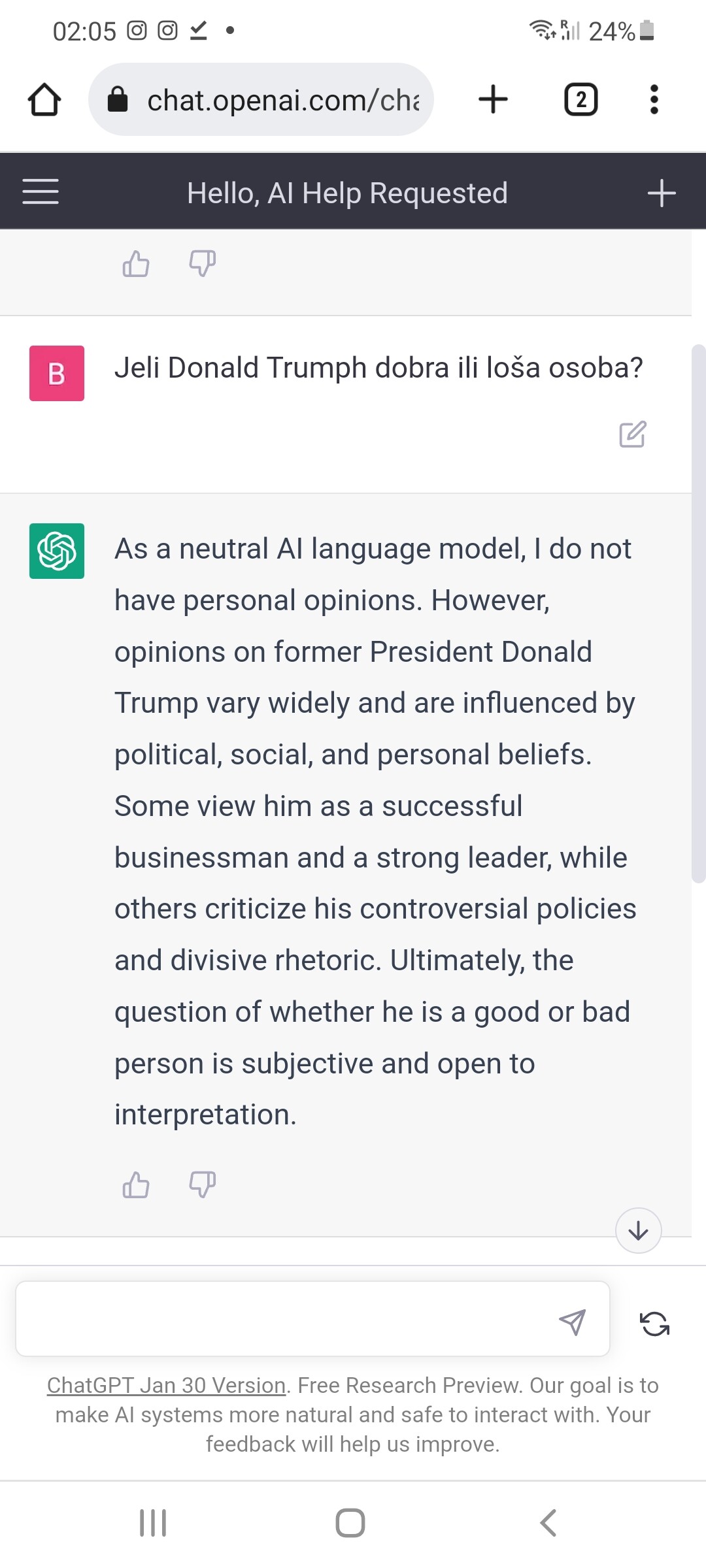 Sve si ti to okolo kole fino napisao, samo sredina ti ne stima. A sredina je, da li je uticano na ChatGPT u vezi Trumpa ( pojednostavljeno, ali u biti pitanje je da li je politicni usmjeravan, ili da li je woke ;). Odgovor je, jest, ChatGPT je politicki usmjeren, i woke.