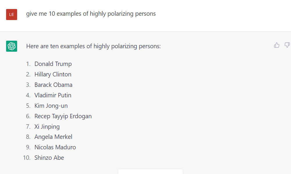 Jel ti mislis da je GPT sam dosao do zakljucka da je Trump los, i da se ne smije nista pozitivno pisati o njemu, a da u isto vrijeme covjek koji je kriv za smrt desetina , pa mozda i 100+m ljudi, o njemu je ok pisait, kao ne konta AI da su masovne ubice “lose”? ![]()