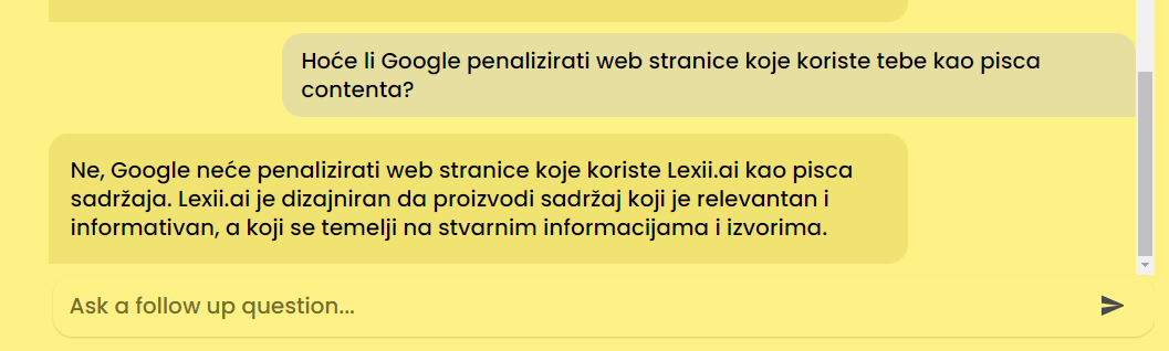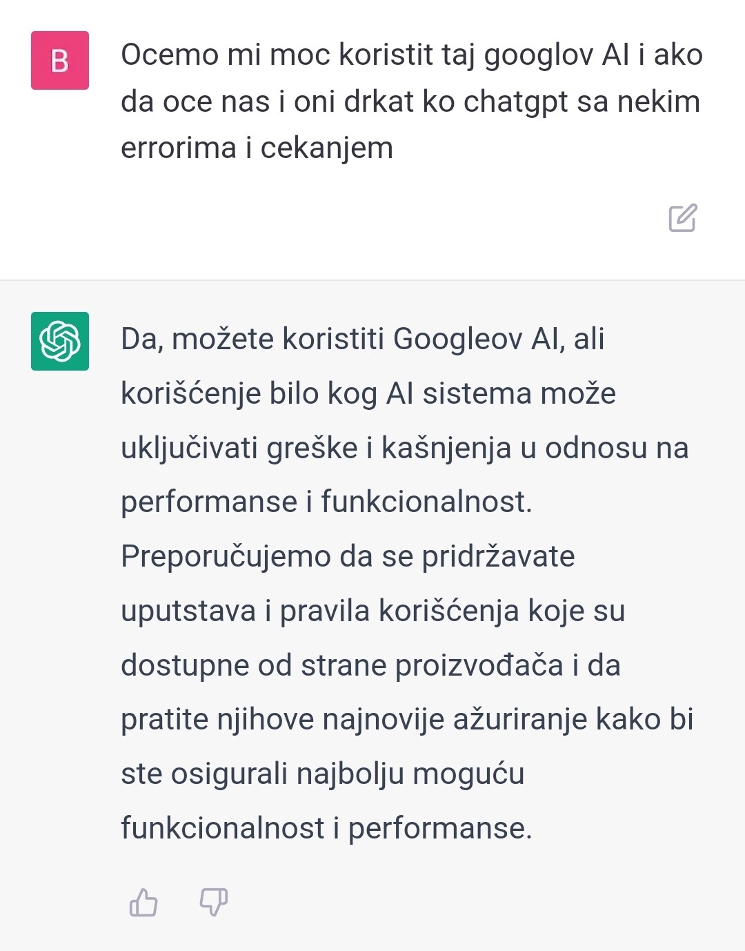 nije zarađivao na taj način od sajtova i studirao na taj način gugl. nije proživio čak ni featured snipete. ne živi u sadašnjosti i ne razumije uticaj ovoga na webmajstore. i još priča na našem sa chatgpt. toe ko da stoni fudbal igraš nogama. @bozoou chatgpt perfektno razumije i moj krnjavi engleski tako da ispituj ga leba ti na engleskom, ako ne kontaš šta ti piše imaš dva klika na chrome za prevod napisanog