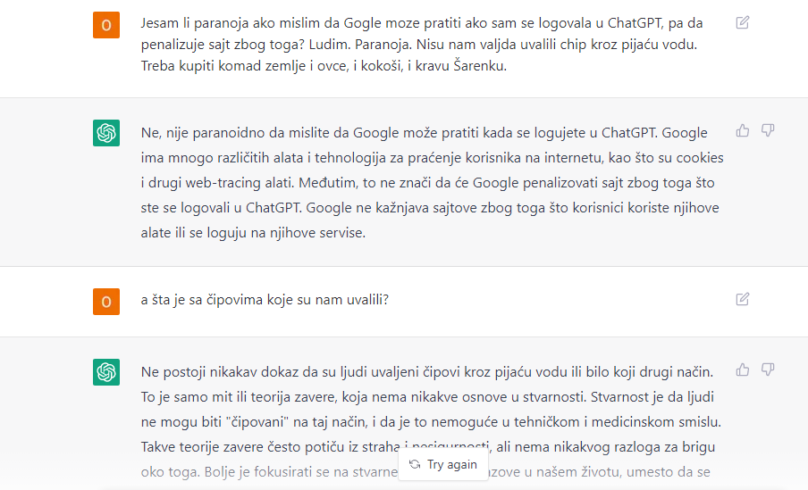 Jesam li paranoja ako mislim da Gogle moze pratiti ako sam se logovala u ChatGPT, pa da penalizuje sajt zbog toga? Loodim. Paranoja. Nisu nam valjda uvalili chip kroz pijacu vodu. Treba kupiti komad zemlje i ovce, i kokosi, i kravu Sarenku.
