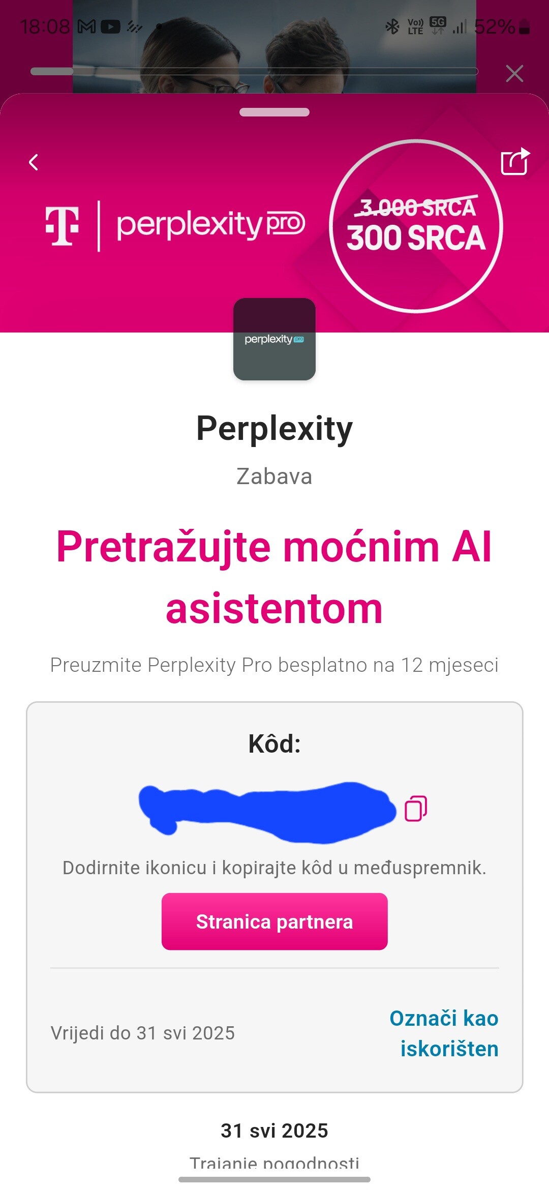 Ako nekog zanima, tmobile nudi za one moments bodove godinu dana pretplate na Perplexity Ai. Ja sam ga danas bas isprobao i za search se cino zakon, bolji od ChatGPT ovako na prvu. Govorimo samo o istrazivanju vijesti, informacija… ne i o drugim stvarima koje radim sa chatgpt.