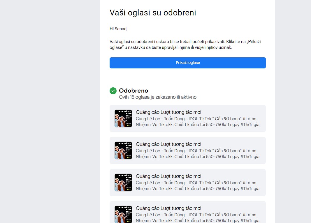 Znaci jos uvijek nemam pristup facebook nalogu al neko je ocigledno hakovo jer dobijam na mail da placam oglase i to neke vijetnamske