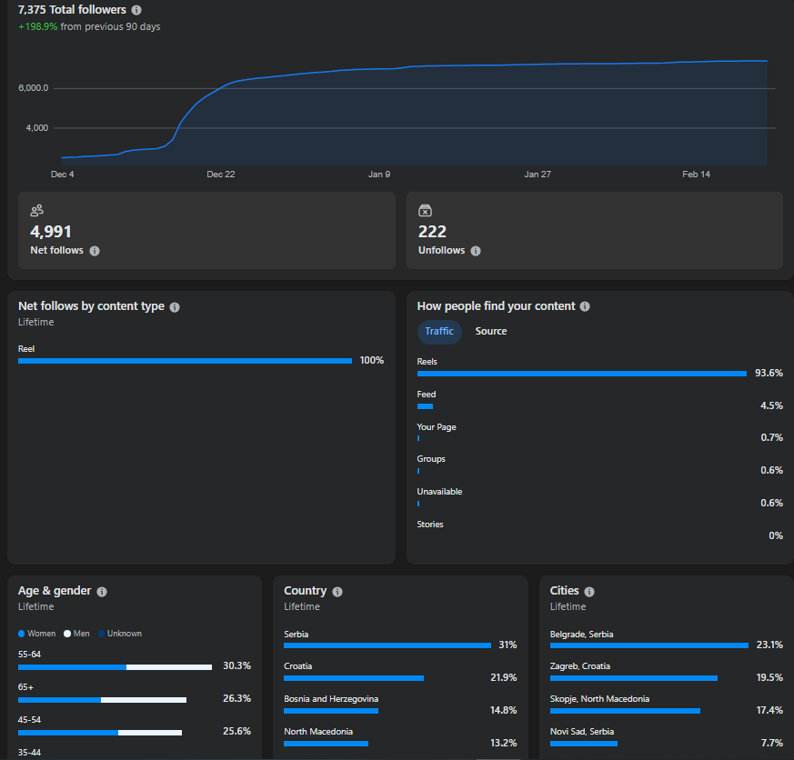 Prvi page je odlican za linkove, politika je u pitanju i ima dobar reach kad se radi. Publika koja prati tupave ratove, Ukrajina, Iran itd. Drugi page ovaj manji je humor u pitanju, odlican reach je bio na reelsima, nikad nisam stavljao nista drugo.