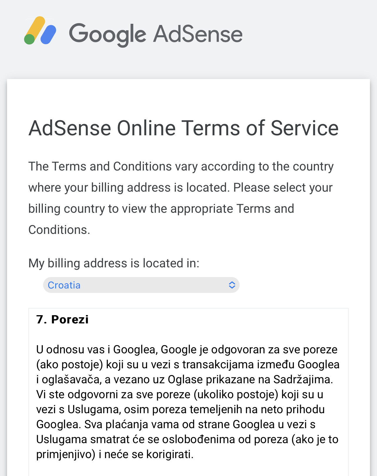 Google sve što plaća publisherima je oslobođeno poreza u Irskoj,ukoliko su publisheri van Irske. Za iznos koji dobijate potrebno je platiti porez u matičnoj zemlji. Zato je potrebno dokazati da plaćate ovaj porez na ovaj način.