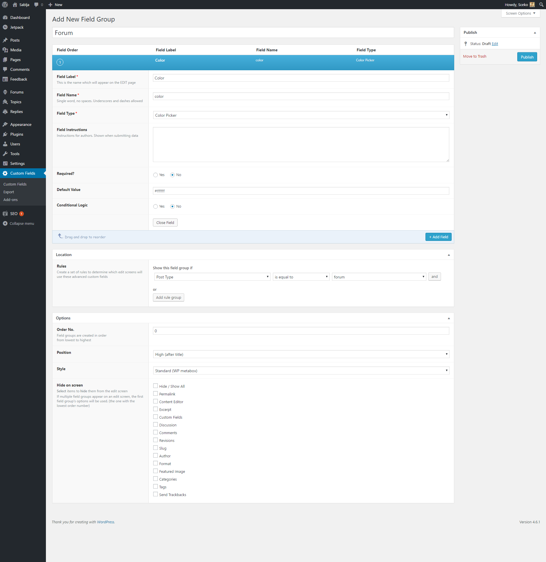 Pise ti sve tamo kako se instalira, moras da instaliras dodatak ACF - Advanced Custom Fields