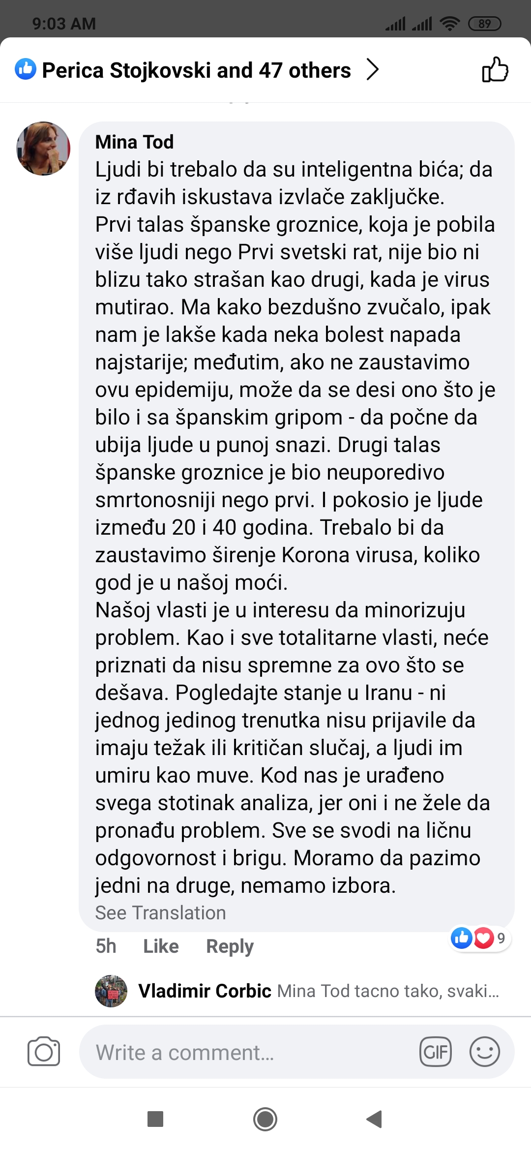Ja mislim da u BiH ništa se nije bolje desilo u zadnji 20 godina. Taman da korona povede ove ukruhe što taru nas i zdravstvo 20 godina. Nek im nacionalizam sad pomogne i propaganda