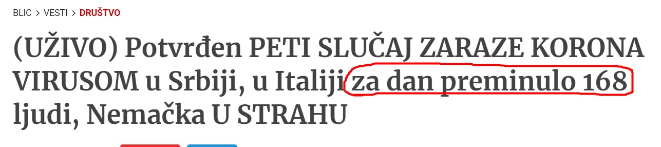 I neko ovde prica o “prehladi kao grip”. Ja jos nisam video da na ovako malom broju ljudi koji su “prehladjeni” bili od gripa, ovoliko odapne…