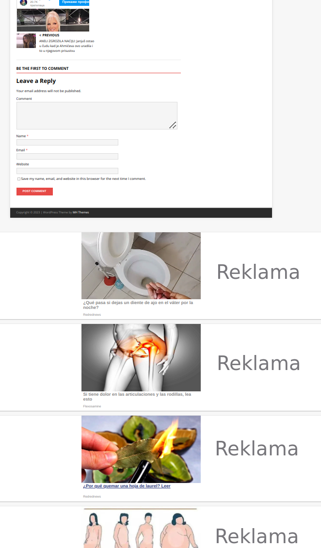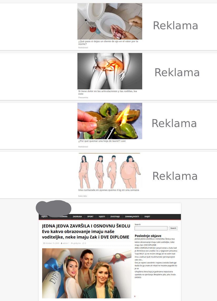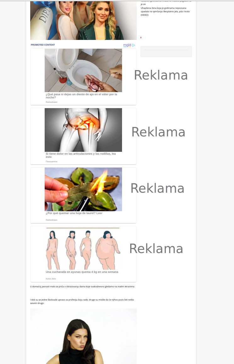 Iznad zaglavlja sajta postavljeno je 4 MGID reklame, zatim slede naslov članka i slika, zatim još 4 MGID reklame, zatim 7 rečenica teksta, nekoliko slika i na kraju još 4 MGID reklame.