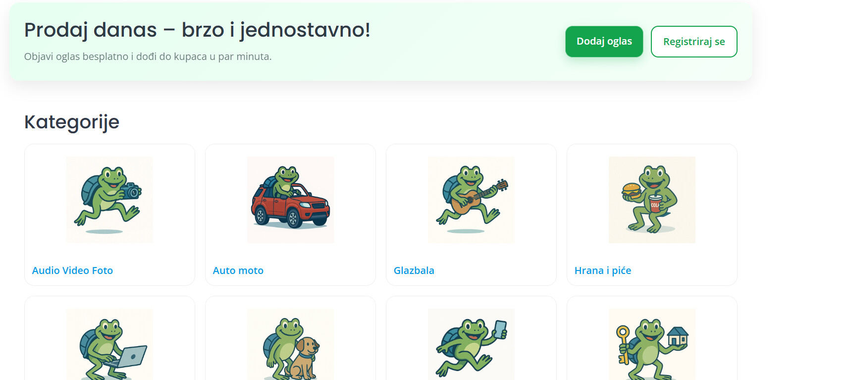 Mi smo moderno mjesto za kupnju i prodaju, ali s malo više života, boje i žabljeg šarma. Naša ideja je jednostavna: stvoriti oglasnik koji je brz, lagan, zabavan i pristupačan svakome – baš kao skok jedne vesele žabe.