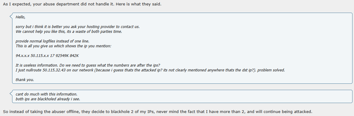 , a vezano za screenshot je problem što je abuse odjel dobio samo jednu liniju loga bez jasnog opisa što je meta i o kakvom se napadu radi. S takvim informacijama ne može se ozbiljno postupati i 90% drugih hosting kompanija bi na takvu prijavu odgovorilo na sličan način ili je odbacilo. SpectraIP je barem reagirao i blokirao promet iako to nije savršeno rješenje.